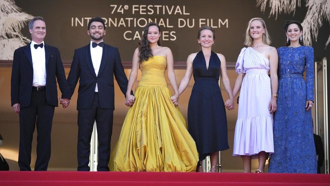 Denis Carot, Mohamad Al Jounde, Melati Wijsen, Flore Vasseur, Mary Finn, dan Marion Cotillard berpose untuk fotografer setibanya di festival film internasional ke-74, Cannes, Prancis selatan. Bigger Than Us mengisahkan tentang perjalanan Melati Wijsen yang berjuang mengatasi masalah sampah plastik. Film dokumenter itu diproduseri oleh aktris kawakan asal Prancis, Marion Cotillard. AP Photo/Vadim Ghirda