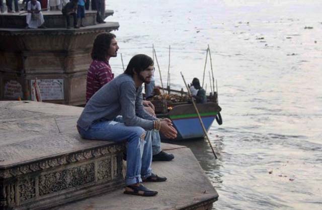- Ashton Kutcher tampak sedang berada di pinggir sungai Yamuna, Vrindavan, India, pada Kamis (30/8/2012). Ia berada di India untuk syuting biopic Steve Jobs.