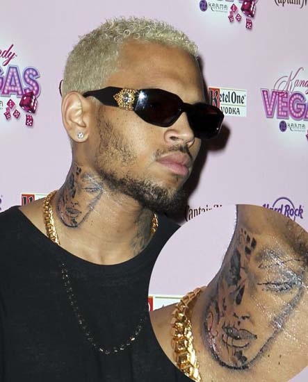 - Chris Brown membuat tato baru di leher dengan gambar mirip mantan kekasihnya, Rihanna. Namun, Chris tidak mau mengakui bahwa gambar perempuan di tatonya itu adalah Rihanna.