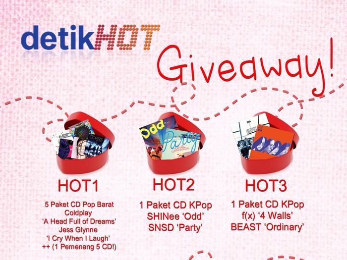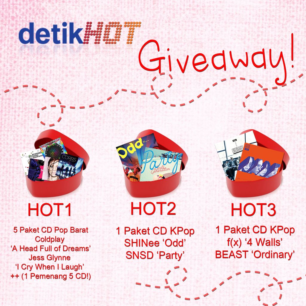 Akan ada 5 (lima) paket CD barat dan 2 (dua) paket CD KPop untuk kalian pembaca setia detikHOT rebutkan di detikHOT Giveaway bulan Februari ini. Bagaimana caranya? Simak peraturannya di bawah ini: