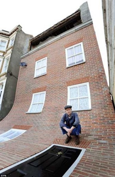 Rumah di kawasan Margareta, Inggris itu dibuat Chinneck jadi seperti memiliki ilusi melorot pada dinding bagian depannya.