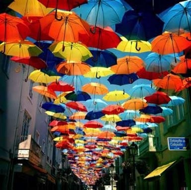 Itu karena ada festival Agitagueda, yang mengubah gang-gang di kota itu jadi dilindungi dengan payung-payung berwarna warni.