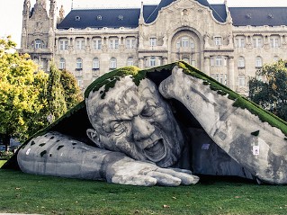 Namun itu bukan pria betulan, melainkan sebuah patung berukuran raksasa buatan seniman Hungaria Ervin Loranth Herve. Ia membuatnya di depan Budapest Szechenyi Square dalam rangka pameran 'Pasar Seni Budapest' yang berlangsung dari awal Oktober ini.